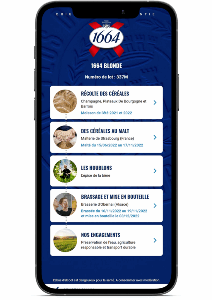 La particularité de ce projet : le consommateur a la possibilité de tracer la provenance de l’orge de sa bouteille de 1664 Blonde grâce à un QR code imprimé sur l’étiquette. Des témoignages d’agriculteurs, la méthode de fabrication et des informations sur le houblon sont également disponibles.